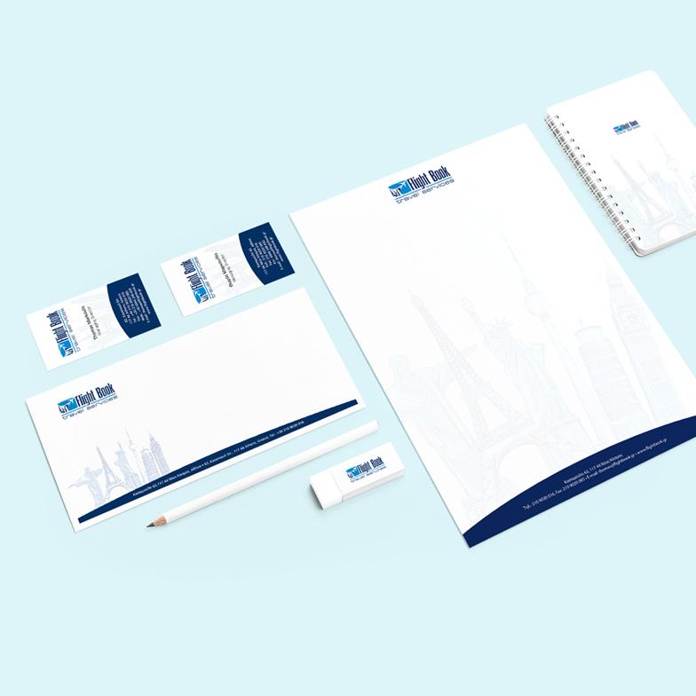Flight Book Εταιρική ταυτότητα Σχεδιασμός και παραγωγή Σχεδιασμός, εφαρμογή και εκτύπωση λογοτύπου σε εταιρική ταυτότητα, πινακίδα και ημερολόγια.